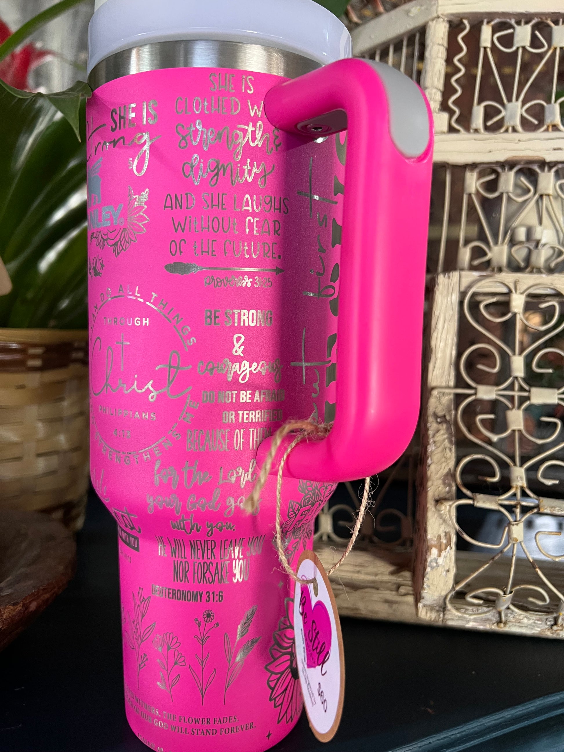 This 40oz pink faith-inspired tumbler features an eye-catching hot pink design with laser engraved faith-based inscriptions and illustrations. The tumbler is adorned with multiple Bible verses and Christian affirmations, making it a beautiful and encouraging accessory for believers.