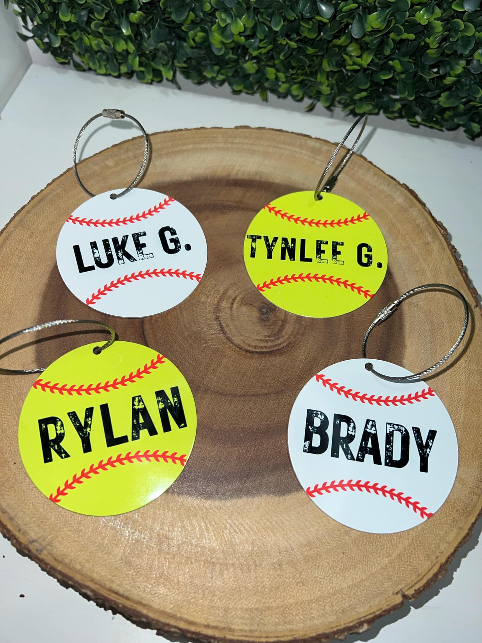 Personalized baseball and softball bag tags featuring player names on durable, high-quality designs. Perfect for teams, tournaments, and gifts. Choose from classic white baseball or bright yellow softball styles. Great for backpacks, sports bags, and gear identification!