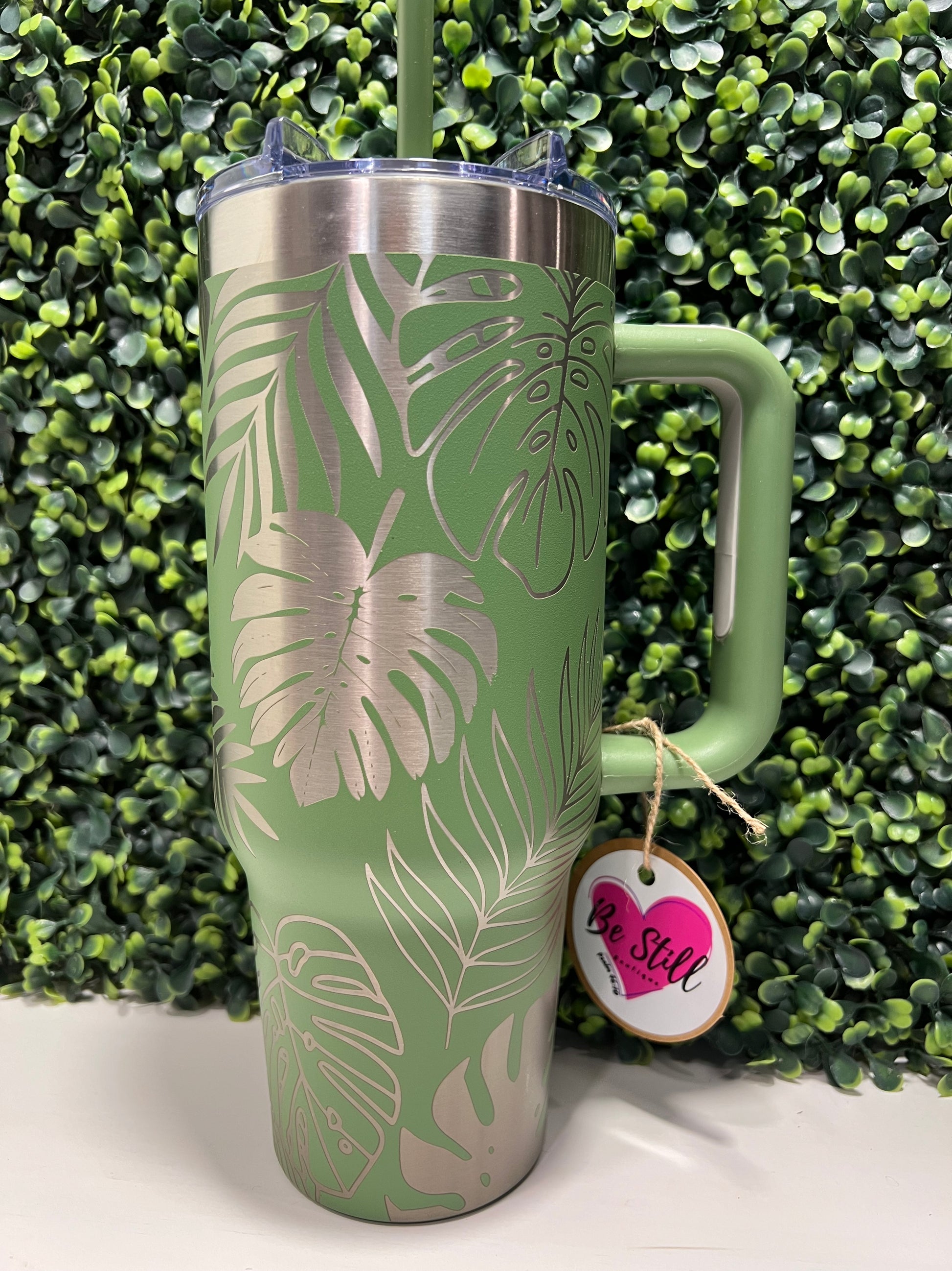 This is a stunning 40oz stainless steel tumbler in a soft sage green color, featuring an intricate laser-engraved monstera leaf design in a metallic silver finish. The tropical-inspired pattern showcases large monstera leaves and delicate palm fronds, adding an elegant and nature-inspired touch. The tumbler is equipped with a sturdy matching green handle, a clear lid with a coordinating green straw, and a tapered base for compatibility with most cup holders.Perfect for keeping beverages hot or cold while embracing a stylish, botanical aesthetic.